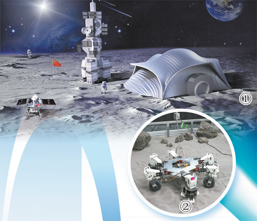 图①:华中科技大学提出的月球玄武基地方案模拟图。华中科技大学供图 图②:太空采矿机器人试验机。中国矿业大学供图